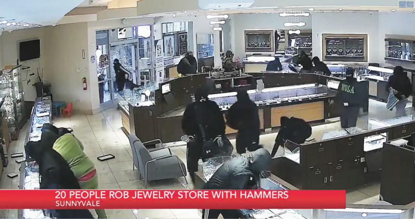 南灣辛尼維爾(Sunnyvale)一家珠寶店周三(12日)下午遭搶劫,劫匪竟然多達20人,他們砸碎陳列櫃,大肆搜略,搶走大批貴重珠寶首飾後逃離現場。警方隨後在101高速公路追車後,逮捕了其中五名疑匪。
