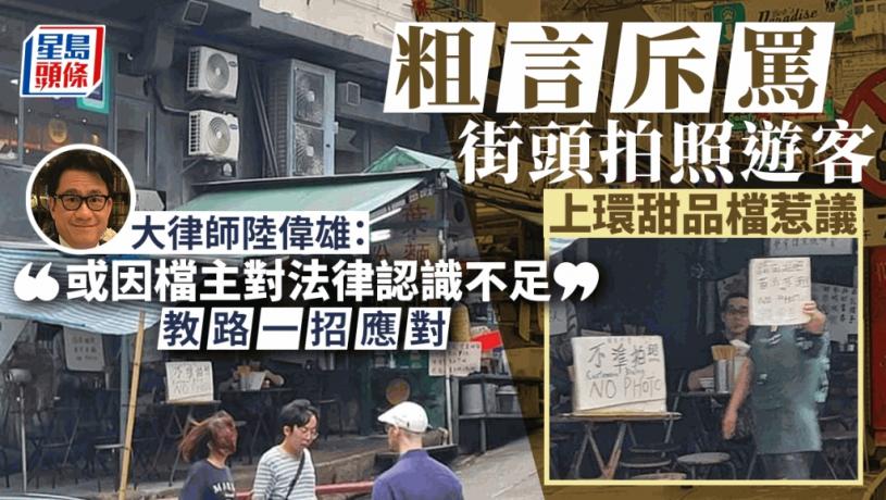 政府近日推動禮貌運動,呼籲餐飲及零售業界等都應以禮待客,彰顯香港好客之都形象。不過社交專頁近日流傳一則帖文,指上環一間甜品檔在店內標明不准拍攝,店主更會粗言穢語指罵在公眾地方拍攝的遊客,引發網民熱烈討論。有大律師向《星島頭條》表示,除非發生兩種極端情況,否則市民在公眾地方拍攝都不屬犯法行為,更教路一招應付惡店主。