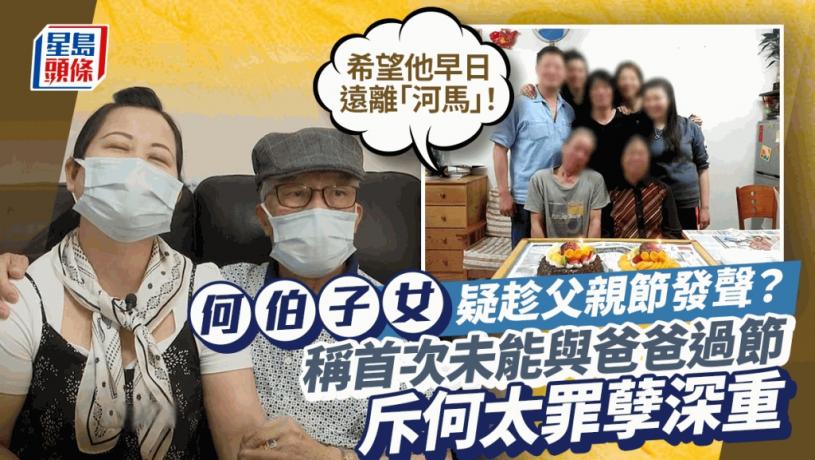 今日是父親節,不過因為「450萬爭產案」而與子女反目的何伯,今年沒有子女相伴,只好在陽江與新任太太慶祝。有網民聲稱代表何家仔女發言的匿名參與者在FB群組留言:「大家好,本人是何家子女代表,今日係父親節,亦係我哋第一個冇得同家父過嘅父親節。我哋希望河馬妳不要再破壞我哋同家父嘅父子父女關係,家父被妳迷惑前一刻,仲有得同我哋去旅遊,被妳迷惑之後就同我哋反目成仇,家父心裡的仇恨全部因妳而起,妳亦因我哋對妳的拒絕,心生惱怒,利用家父向我哋進行報復,妳罪孽深重!然而,何伯始終是我們的父親,我們在此向家父說一聲『父親節快樂』,亦希望他早日遠離河馬。謹以此平台宣佈。」