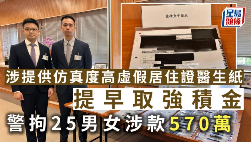 黃大仙警區重案組第二隊林英品督察講述案情時表示,被捕18男7女,年齡26至58歲,報稱職業為建築工人、文員及售貨員。案情指強積金供款人向強積金受託人公司提供虛假文件,包括虛假澳居民居住證及虛假民政事務署宣誓聲明,聲稱自己永久離港前往內地居住,亦有人提供虛假醫生證明,表示自己完全喪失行為能力不能工作。目的是希望提早提取強積金供款。消息稱,有關虛假文件仿真度極高。