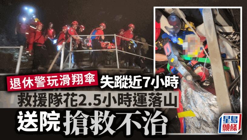 一名退休警員昨(17日)於大嶼山玩滑翔傘失蹤,政府跨部門到場搜救,飛行服務隊亦到現場協助。至晚上9時許,事主終被尋回,但他意識不清醒,陷入昏迷。消防於今(18日)凌晨2時許,終將事主救落山,並由救護車送往北大嶼山醫院,惟經搶救後不治。