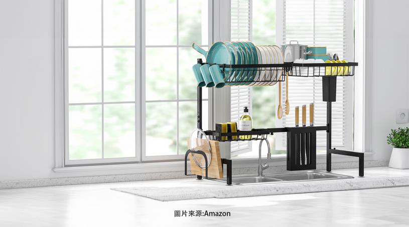 除了多功能的籃子外,還配有一個餐具架、切菜板架、刀架和五個實用掛鈎,無論是廚房小工具還是常用餐具,都能找到合適的安置位置。這個架子不僅能有效利用水槽上方的空間,還能節省寶貴的台面空間,讓您的廚房更加寬敞、整潔。