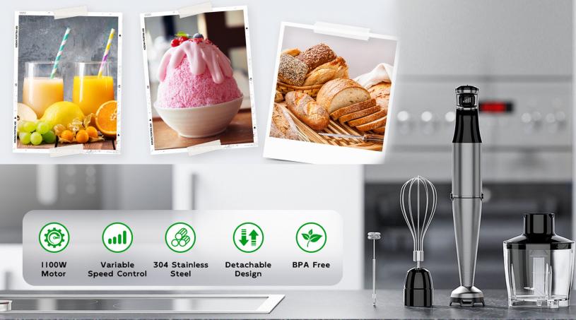 這款手持式攪拌機配備強勁的1100瓦全銅電機,無論是湯、嬰兒食品還是冰沙,都能在幾秒鐘內輕鬆處理,創造出天鵝絨般光滑的果泥效果。使用起來也非常方便,變速觸發器設計讓你可以隨心所欲地控制速度,只需輕輕一按即可從低速切換到高速,輕鬆打漿、乳化或攪打。不再擔心食材飛濺,獨特的食品級尼龍刀片防護罩有效防止飛濺,同時保護你的鍋碗瓢盆不被刮傷,讓你的廚房始終保持乾淨。這款攪拌機的手柄設計也非常符合人體工學,提供防滑且舒適的抓握力,即使連續使用也不會感到疲憊。它不僅僅是一個攪拌機,還配備了多個配件,包括切碎器、攪拌機和起泡器,讓你可以輕鬆應對各種烹飪需求。所有配件都易於拆卸和清潔,無需擔心清潔的麻煩。攪拌機採用強化食品級刀片,即使使用熱原料也非常安全。破碎機和切碎機都100%不含BPA,讓你使用起來更加放心。
