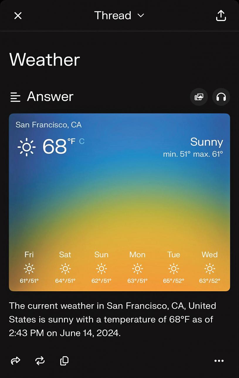 在新的搜尋結果例如天氣狀況和貨幣匯率,Perplexity沒有連結任何來源。斯里尼瓦斯上月提到,該公司正在與一家名為Tako的AI搜尋引擎資訊視覺化公司合作,顯示股價等資訊。