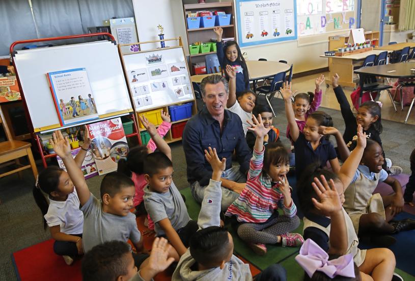 圖為加州州長紐森表示將推出立法,課室禁用手機。美聯社資料圖片