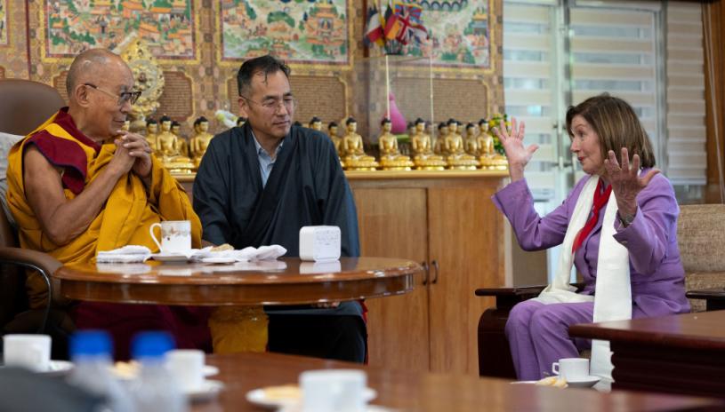 法新社報道,共和黨籍議員麥考爾(Michael McCaul)和佩洛西率領跨黨派眾議員組成的代表團造訪印度北部山城達蘭薩拉,拜會88歲的達賴喇嘛。佩洛西在流亡政府西藏電視台轉播的談話中,對西藏群眾說,能夠會見達賴喇嘛是一種「榮幸」。