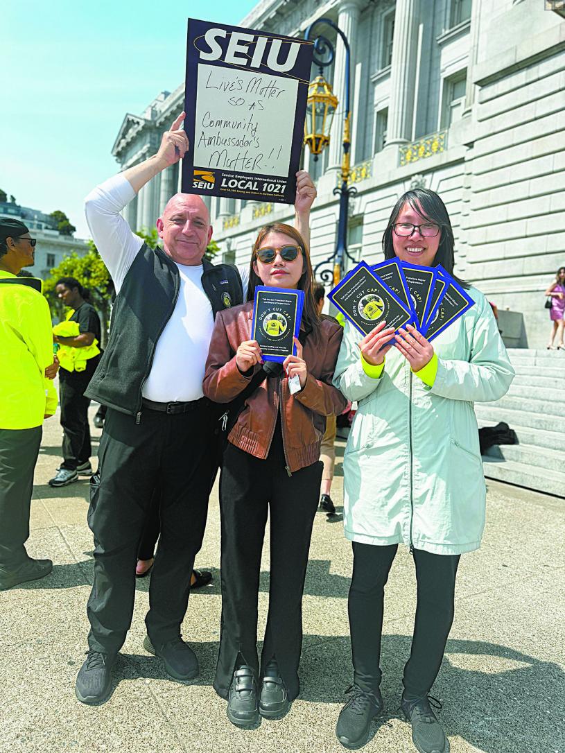 18日上午,多位市參事、社區組織負責人、SEIU 1021工會代表和CAP計劃的支持者聚集在市政廳門前集會反對預算取消,形容切斷依靠這些社區大使所服務人群的基本生存條件。