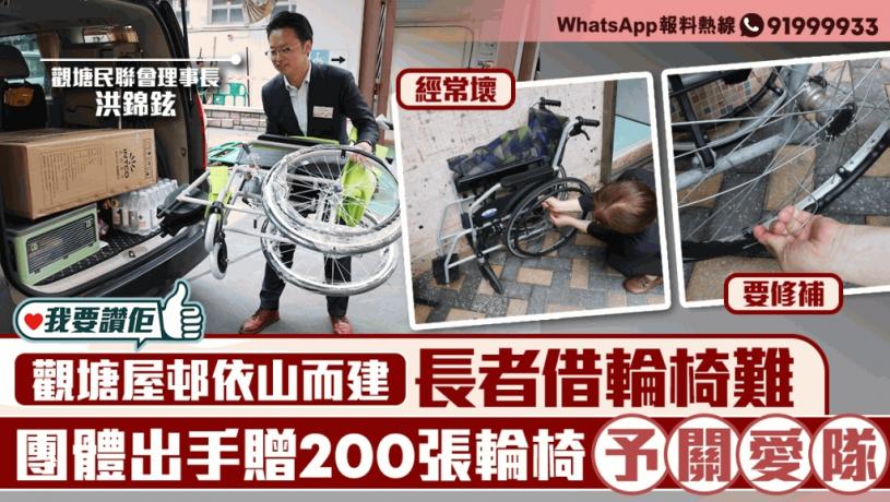 觀塘不少屋邨依山而建,長者平日需要輪椅輔助出入。有區議員反映辦事處長期放置5至6部可借用輪椅,亦告不敷應用。有醫療器材供應商日前向觀塘民聯會送贈200部輪椅,再轉交予區內40隊關愛隊。民聯會理事長兼觀塘區區議員洪錦鉉形容輪椅轉贈關愛隊可在社區循環借用﹕「送輪椅畀人只係200人用到,但畀關愛隊就會惠及更多巿民。」他指,做法值得推廣至其他地區試行。