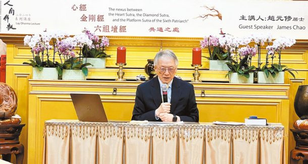 國際佛光會信徒總代表趙元修居士解譯「心經、金剛經和六祖壇經的共通之處」。 芝加哥佛光山提供