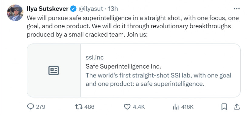 OpenAI聯合創始人蘇茨克維爾在X平台上宣布創辦新公司。