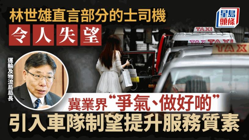 的士服務屢被詬病,運輸署計劃發出5個或以下的士車隊牌照。運輸及物流局局長林世雄表示,非常關注的士服務,期望業界可以「爭氣」、做好啲」,他認為部分的士司機的服務確是令人失望,希望通過引入「的士車隊」能夠帶來一個新面貌,並通過加重罰則,將的士服務質素提高。