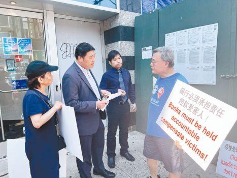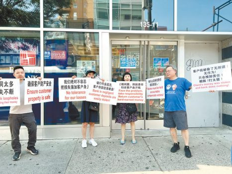 「還我血汗錢!」法拉盛社區互助守望隊率領三名華人於21日在法拉盛抗議。這三人的存款分別在不同的銀行不翼而飛,他們向多個機構求助無果,因此以抗議的方式引起有關部門的重視。