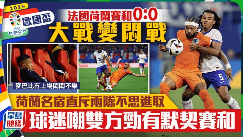周五法國對荷蘭的歐洲國家盃D組次輪賽事,被外界視為矚目大戰,賽前更因為法國鋒將基利安麥巴比有機會戴面罩上陣而話題性更多。可是雙方今場都踢得保持,特別是荷蘭大部份時間都不思進取,令捱夜睇波的球迷都十分無癮,直斥浪費兩小時觀賽。不過荷蘭上下滿意取得1分,直言出線在望。