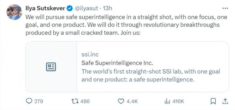 OpenAI聯合創始人兼前首席科學家蘇茨克維爾(Ilya Sutskever)正在創辦一家專注於安全的新人工智能(AI)公司。在19日發布的一篇貼文中,他透露設立了新創公司Safe Superintelligence Inc.(簡稱SSI),「唯一的目標和產品」就是創建一個安全且強大的AI系統。