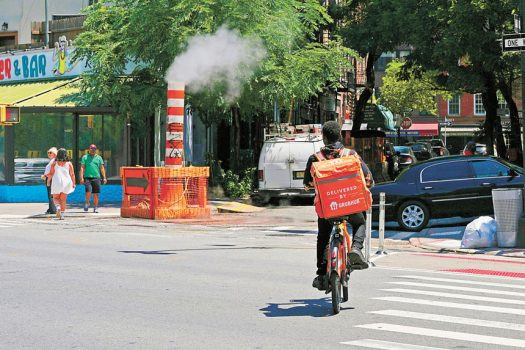 NY1報道,在消費者和工人保護委員會聽證會上,市議員討論一項提案,要求Grubhub和Uber Eats等送餐應用程式公司對旗下外賣郎衝紅燈或在人行道上騎行等交通違規負責。