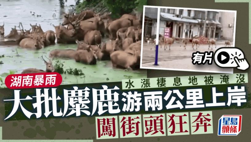 內地多個省份續有暴雨,湖南近日持續暴雨導致洞庭湖區的外河水位持續上漲,6月16日至23日,洞庭湖區累計平均降雨量為139毫米,其中最大的點降雨量達到434毫米。由於洞庭湖湖水上漲,在岳陽縣鹿角碼頭附近,大量野生麋鹿游上岸靠近居民區。