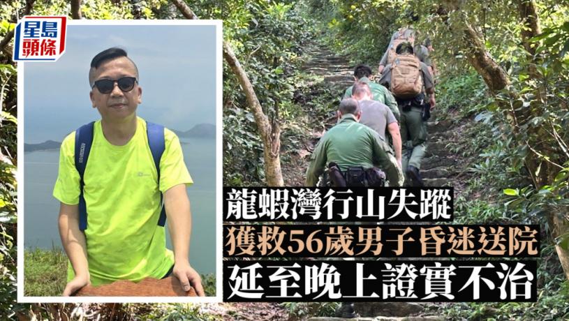 將軍澳56歲男子曾承基昨日(23日)前往清水灣郊野公園龍蝦灣一帶遠足,其後失去聯絡,警方及消防接報後到現場一帶搜索,政府飛行服務隊亦出動直升機協助,至今早(24日)救援隊伍分批登山繼續搜救,終在山頭位置尋獲昏迷男事主,其後由直升機吊起送往東區醫院搶救,惟至晚上7時25分宣告不治。