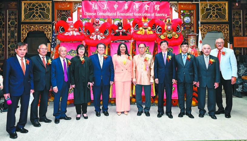 (僑社記者馬紅兵報導)中華總會館總董交接典禮於7曰2日下午五時三十分在總會館禮堂隆重舉行,中領館總領事張建敏、領僑處主任王一鳴、領事姚瑤親臨;監誓人鄧孟詩法官; 市長布里德、市政府律師邱信福、市參事會主席佩斯金的助理、市警察委員余健全蒞臨祝賀並頒發賀狀;新任總董暨三邑總會館主席楊國興、滿任總董暨寧陽總會館主席雷華欽、合和總會館主席謝躍池、岡州總會館主席張逢濯、陽和總會館主席陳國慶、人和總會館主席蔣澤綿、通事劉榮浩、中文助理廖伽敏;星島日報美西版社長梁建鋒;美國華商總會會長孫志雄、常務副會長譚念帖;中華總會館商董、三邑總會館書記陸潮基、南海福蔭堂總理何偉明、順德行安堂主席吳國寶、番禺昌後堂總理楊幹能暨僑界嘉賓、總董寶眷出席觀禮。通事劉榮浩主持交接典禮秩序。現場奏響莊嚴豪邁之美國國歌,柔功門醒獅團成員親臨祝賀,呈送吉祥,為交接典禮拉開序幕。
