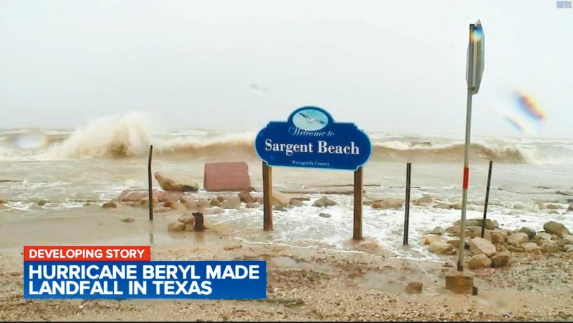 熱帶風暴「貝里爾」(Beryl)重新成為颶風之後,登陸德州時為區內帶來狂風暴雨,造成至少3人死亡,接近300萬戶家庭和企業停電,估計數天之後才可恢復通電,航空交通也大受影響,全國超過1700趟航機取消。專家預料,「貝里爾」將掠過阿肯色州,然後襲向中西部,多個州份面臨龍捲風威脅。