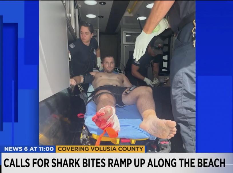 本報訊/圖:21歲男子在獨立日(4日)當天在龐塞進鎮附近的新士麥那灘市海滩淺水區踢足球時被鯊魚咬傷。clickorlando.com電視畫面