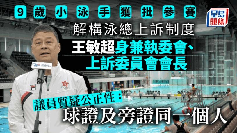 泳總執委會昨日(13日)召開特別會議,一致通過前港隊游泳代表方力申旗下一名9歲泳員,將獲准以個人身份參加分齡游泳錦標賽。但如果不滿這個結果有何機制處理?《星島頭條》翻查泳總會章,發現只有正式屬會可向泳總上訴委員會作出上訴,但現屆泳總上訴委員會正、副會長,與執行委員會的正副會長為同一批人,即是王敏超身兼執行委員會會長及上訴委員會會長,而且方力申的泳會是「競賽屬會」,亦因不合資格不可上訴。一直跟進事件的新民黨立法會議員何敬康形容,即是球證及旁證都是同一個人,質疑其公正性及當中涉及利益衝突。