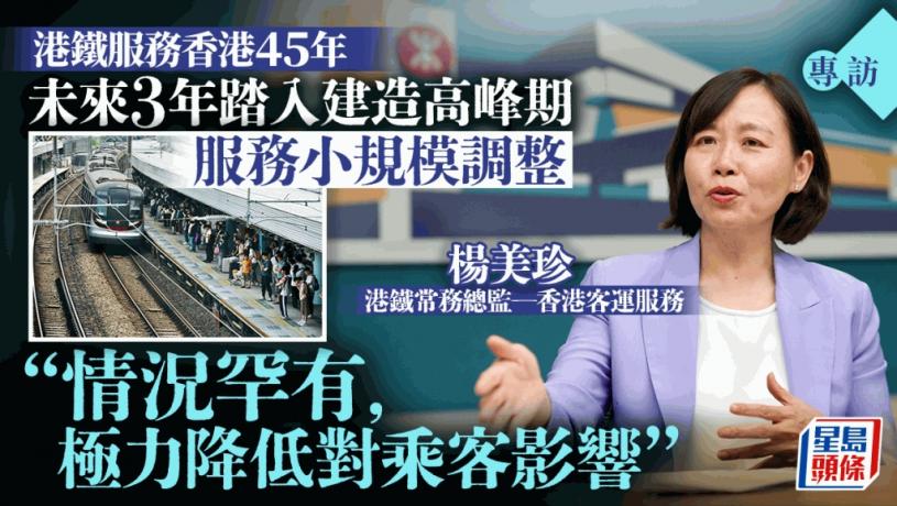 香港擁有世界級的公共鐵路交通網絡,現時版圖仍不斷更新、擴大。楊美珍說,新的鐵路項目在未來2至3年踏入建造高峰期,大部分已於今年陸續展開關鍵土木工程,如東涌線延綫、東鐵綫古洞站、小蠔灣站及屯門南延綫,而洪水橋站亦已開始準備工程, 當中會在現有3條營運中的東涌綫、東鐵綫及屯馬綫上加建新車站。楊美珍透露,今年第四季東涌綫將有一次小規模的列車服務調整,「𠵱家仲睇緊啲細節,到時有詳情,一定會盡早同公眾交代」,而工程團隊亦會仔細規劃安排,暫時傾向提早收車,會努力把對乘客的影響減到最低,並提早透過不同渠道發布訊息,盡早告知公眾。