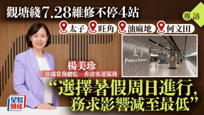 今年是觀塘綫通車45周年,因應基建設施更新,港鐵早前宣布,7月28日將罕有暫停全日來往太子、旺角、油麻地及何文田4站的列車服務。港鐵常務總監─香港客運服務楊美珍表示,此次工程涉及觀塘綫油麻地站附近的一個「交叉渡線」,須更換位於該段隧道約7米高頂部、用作懸掛電纜的大型金屬吊架,現時運作安全,但根據其資產狀態及生命周期,仍然需進行更換。她提到,工程位置獨特及工序複雜,「個交叉渡綫頂部比一般隧道高啲」,無法於一晚「黃金兩小時」內完成,亦不能分階段進行,故選擇在暑假期間的一個星期日進行,務求對乘客的影響減至最低。