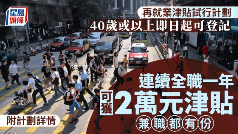去年《施政報告》宣布推行為期3年的再就業計劃,旨在增加中高齡人士重投工作的誘因,任何可在香港合法受僱的40歲或以上香港居民,並已連續三個月或以上沒有從事任何獲酬工作,均可參加再就業計劃。若參加者連續完成6個月全職工作,可獲發10,000元津貼,連續完成12個月全職工作則可再獲發10,000元津貼。完成兼職工作的參加者可獲發半額津貼。每名參加者在計劃的推行期間最高可獲20,000元再就業津貼。