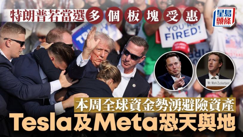 一場槍擊事件,成為今年美國大選的關鍵時刻,加上美國共和黨將於本周一至四(15日至18日)舉行全國代表大會,以確定總統和副總統候選人,勢令全球目光更關注大選動向及「特朗普交易」對市場影響。據外媒報道,有市場人士認為開盤初時交易員將湧入避險資產及重新評估與選情相關交易,包括黃金、比特幣、日圓、美元及美債。此外,Tesla(TSLA)行政總裁馬斯克與特朗普關係變得友好,可能令該股有某程度上的受惠,相反Meta(META)則可能因此受累。下文亦會盤點各類相關股,務求令讀者一文看清「特朗普概念」。