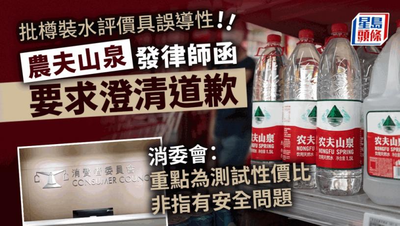 消委會昨日(15日)舉行新一期選擇月刊記者會,當中發表市面上30款瓶裝水樣本測試結果,指所有樣本可安心飲用。不過報告中提及「農夫山泉飲用天然水」的溴酸鹽含量達歐盟上限,農夫山泉今早(16日)向消委會發律師信,指消委會的文章針對農夫山泉產品作不客觀評價,對其公司聲譽造成巨大傷害,要求消委會澄清並道歉。