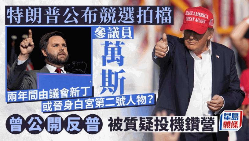 昨日,特朗普同時透過社交平台公布重大消息,宣布揀選萬斯為競選拍檔。他說,經過長時間的仔細考慮,並考慮到眾多人選的卓越才能,他決定萬斯是最適合擔任美國副總統的人選。