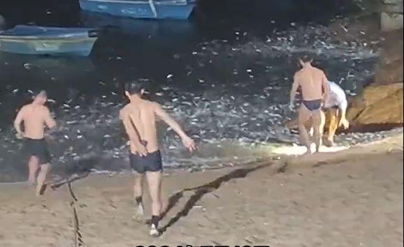 「拿盆子,拿盆子去,撈魚!」有人在視頻中呼喊,一群遊客奔向海邊,瘋狂撿魚。