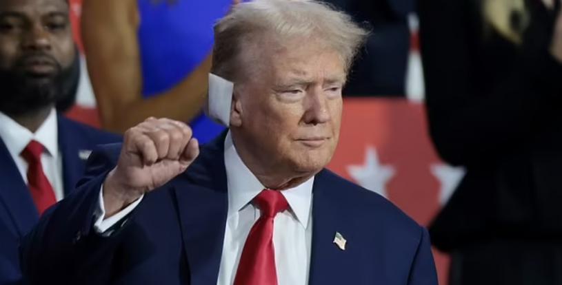 前總統特朗普遭遇暗殺未遂事件後,頭上包裹繃帶出席共和黨全國代表大會,在場觀眾報以熱烈歡呼,不斷高喊「戰鬥」的口號。