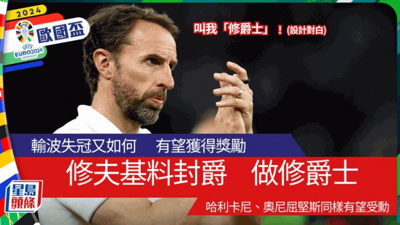 英格蘭雖然在周日歐洲國家盃決賽不敵西班牙,成為賽事史上首支連續2屆屈居亞軍的球隊,但領隊修夫基仍然可望獲得獎勵。消息指英國首相府正考慮表彰修夫基作為英格蘭領隊期間取得的輝煌成就,給予他爵位頭銜,成為修爵士。