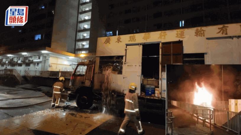 黃大仙發生火警。今日凌晨2時許,竹園南邨街市外一輛24噸中港運菜貨車在卸貨期間,左邊前輪位置突然起火,冒出濃濃黑煙,攻上半空,其後火勢愈燒愈猛,整個車頭部分被烈焰吞噬,消防接報到場,趕急開喉將火救熄。現場所見,貨車左邊車頭邊緣被燒至熔爛,車前擋風玻璃爆破,火熄滅後消防在車尾貨斗灌水,防止復燃。有居於竹園邨的網民目擊起火情況,直指「聞到陣燒燶味道,嚇到醒咗」。
