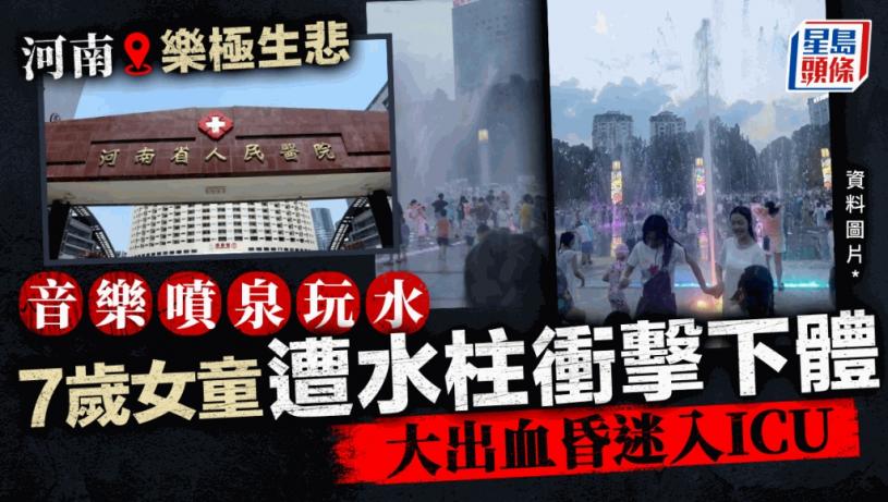 河南發生恐怖意外,有7歲女童在音樂噴泉玩水,卻遭強勁水柱衝擊至下體大出血,出血量逾200毫升,一度休克昏迷,送院搶救,需留醫七天才可出院。