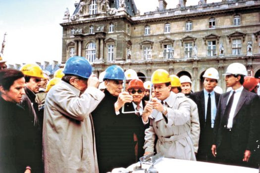 密特朗總統、貝聿銘1987年在羅浮宮金字塔施工現場查看一塊玻璃。