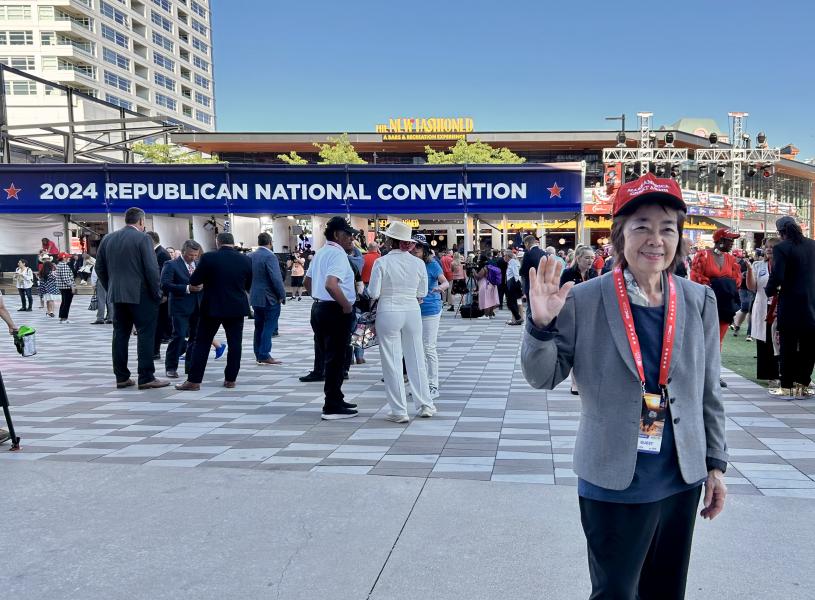 她指出,儘管在美國可以隨時更換自己的黨派,但是她幾十年來都是堅定的共和黨人,從來也沒有選擇過別的黨派。她於2017年至2018年擔任特朗普總統政府華盛頓特區美國交通部的媒體高級顧問;2018年至2020年擔任華盛頓特區共和黨全國委員會亞太裔媒體總監。「我當年在白宮和特朗普共事了3年,他待人很親切,充滿了生意人的熱情大方。」