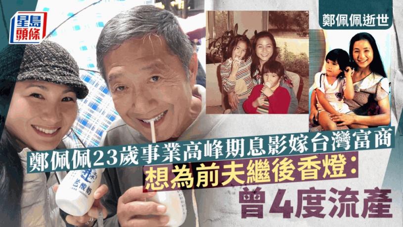 一代武打女星鄭佩佩今日(19日)驚傳逝世,享年78歲。鄭佩佩1963年出道,很快便憑電影《大醉俠》一炮而紅,她在事業高峰期選擇結婚,1970年嫁給台灣富商原文通後息影,移居美國。鄭佩佩先後為原文通誕下三女一子,不過她於1987年與丈夫離婚,更曾為對方多次流產。