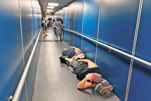 全球大當機導致航班延誤,洛杉磯國際機場旅客被迫在登機橋上睡覺。美聯社