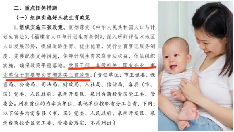 近日,一份疑似福建泉州的人口政策文件截圖在網上流傳。文件信息主要為落實三孩政策的有關工作安排,其中提到,「黨員幹部、各級機關、國有企業、事業單位幹部要帶頭貫徹落實三孩政策。」這引發了公眾對「變相強制」生育的擔憂。