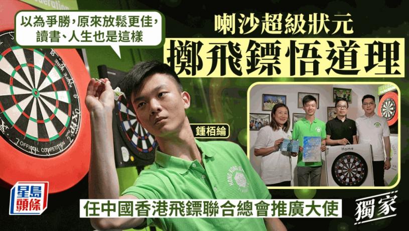中學文憑試(DSE)日前放榜,「超級狀元」之一、就讀喇沙書院的鍾栢綸日前透露自己熱愛擲飛鏢,藉此減壓;他接受本報專訪時形容,擲飛鏢是「治癒心靈」的運動,更從中悟出待人處事之道。他憶述,初中時自己執意成為「狀元」,連參加飛鏢作賽也冀盼「爭勝」,直至中三時,他終承受不住龐大的心理壓力,竟無法在賽場上擲出飛鏢,因而意識到需要調整面對成敗的心態,放下對別人眼光及成為狀元的執着。