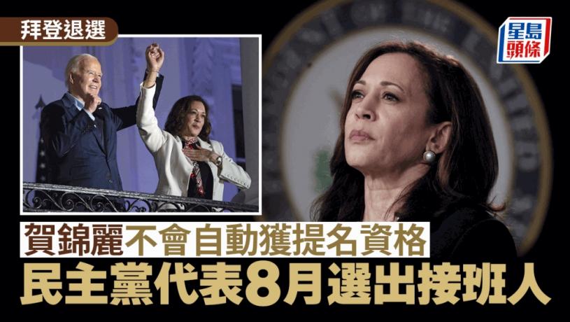 美國總統拜登突然宣布退選,不再爭取連任,力挺副總統賀錦麗接棒。不過,依民主黨規定,拜登初選贏得的黨代表票不會直接轉給賀錦麗,因此不會自動獲得提名資格,而是要等到8月由近4000名黨代表在民主黨全國代表大會上投票決定後,才決定由誰披掛上陣。民主黨最快可能8月初以線上方式舉行。民主黨全國代表大會主席哈里森則強調,將會依照黨內規則,透明、有序地選出能團結贏得選舉的人選。