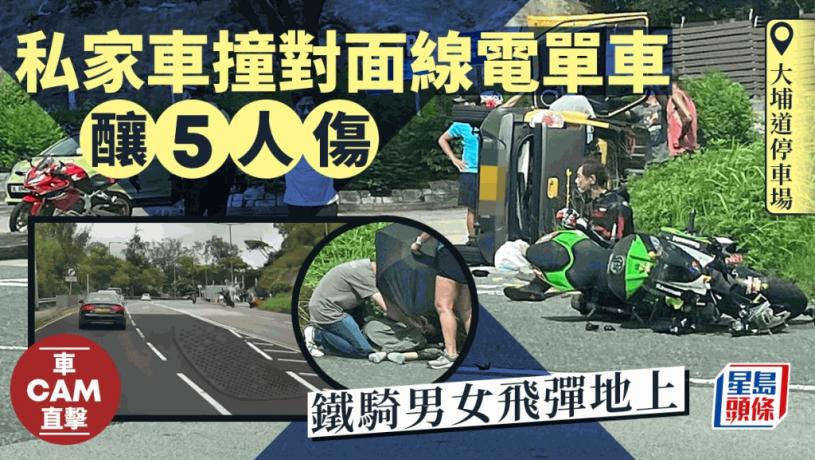 今(21日)午2時許,深水埗大埔道發生私家車與電單車相撞,私家車翻側,5人受傷。據悉,肇事私家車沿大埔道往沙田方向行駛,準備右轉入停車場時,與迎面駛至的電單車發生猛烈相撞,電單車一對男女飛彈地上,私家車失控翻側,車上一家三口一度被困。