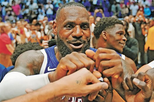 詹姆斯成為美國男籃致勝的關鍵球員,賽後與隊友擊拳相慶。網上圖片