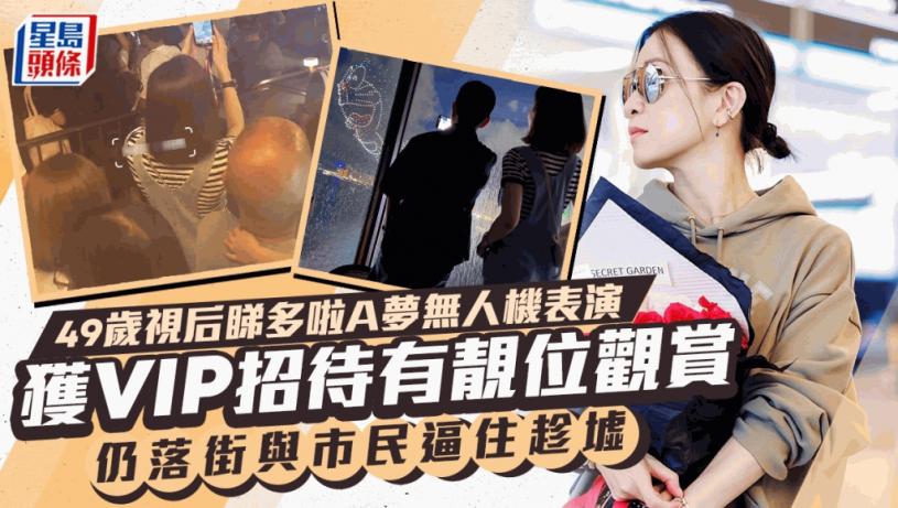 三屆視后佘詩曼去年憑劇集《新聞女王》再度人氣急升,完成手上工作後,佘詩曼便留私人時間約朋友、去旅行。昨晚多啦 A 夢無人機匯演再次在維港上空舉行,佘詩曼獲安排VIP招待觀賞,更在尖東被網民捕獲。