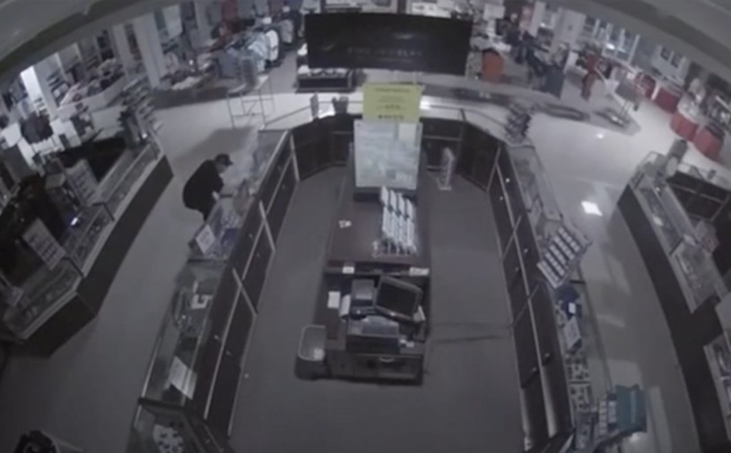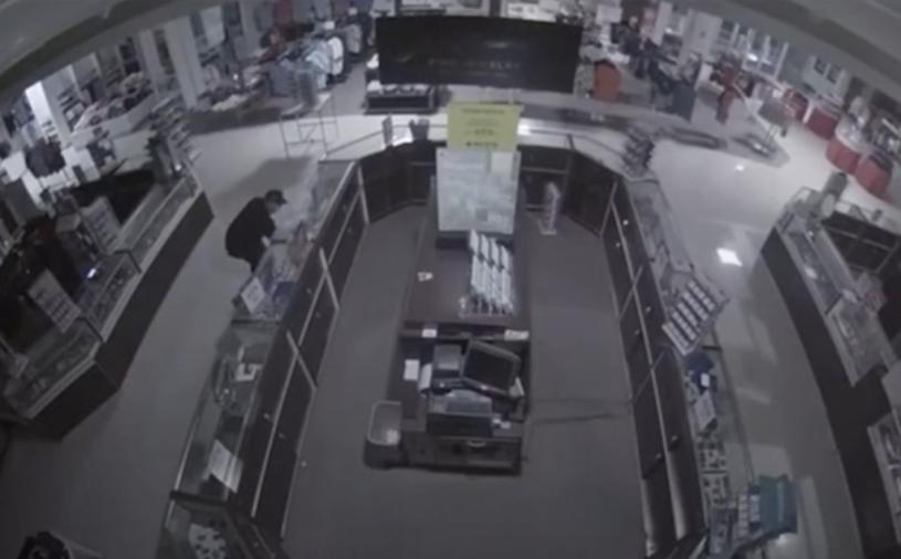 監控視頻顯示,該男子在該市的JC Penney用錘子砸碎了玻璃櫃,然後伸手進去盜竊珠寶。