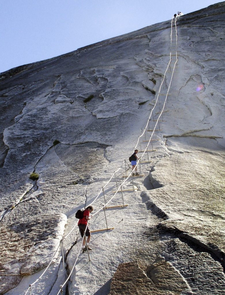 他們與其他徒步旅行者一起沿著由纜索系統支撐的400呎長步道前進,到達山頂時看到一覽無遺的優山美地山谷和高聳山脈的美景。但烏雲突然出現,兩人於是盡快下山,但繩索步道的人因為害怕而緩慢謹慎地行進,不久即遇上暴雨,被困在纜索上。