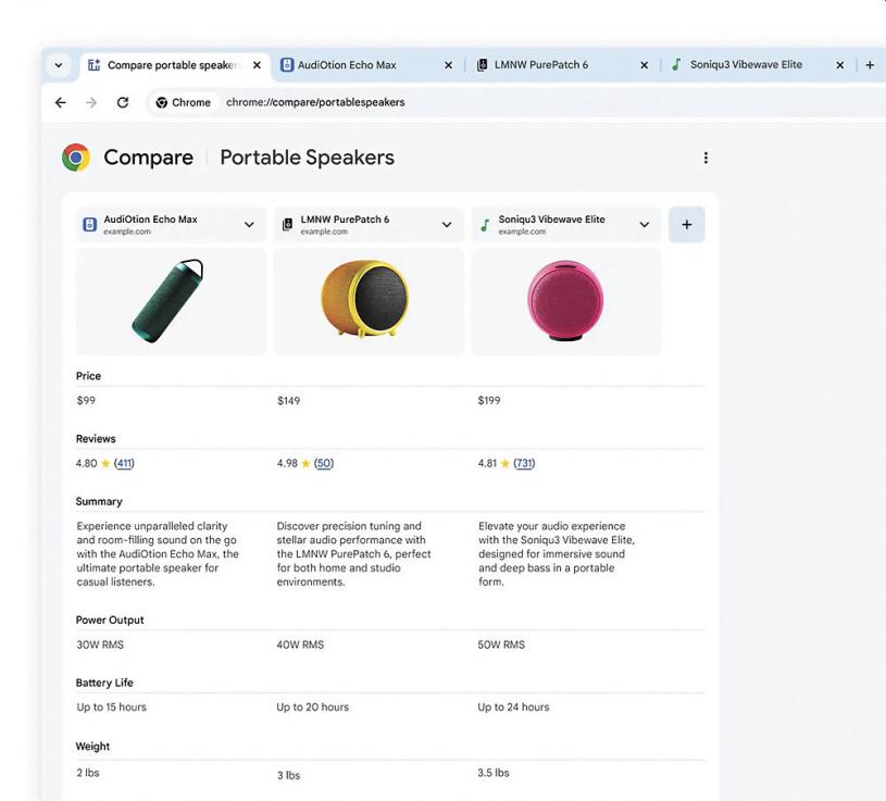 谷歌引入一項名為「分頁比較」(Tab Compare)的功能輔助用戶購物,未來數周推出。當用戶開啟多個分頁搜尋商品,Chrome就會提供AI產生的摘要。例如用戶搜尋一個新藍牙揚聲器,正在瀏覽不同網頁,新功能就會在同一處地方顯示細節,例如產品規格、功能、價格和評分等。