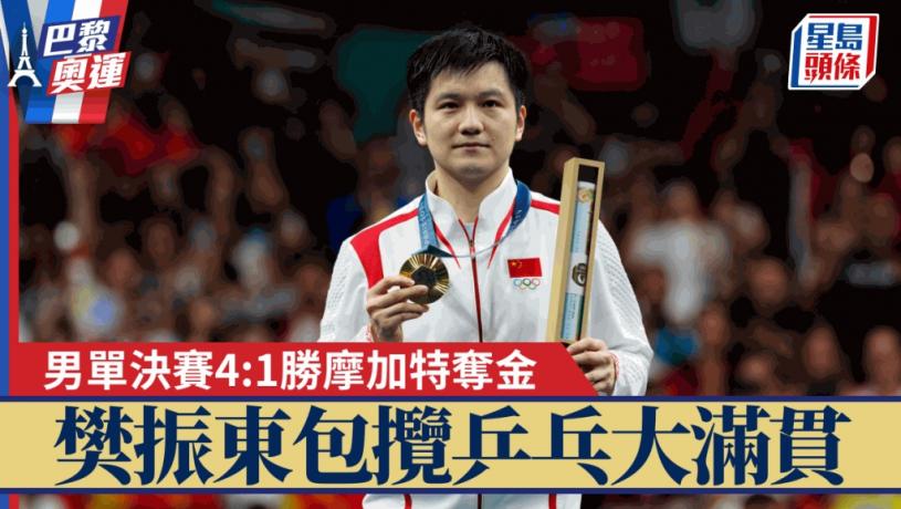 樊振東於巴黎奧運乒乓男單決賽,以局數4:1擊敗瑞典的摩加特,彌補上屆東京奧運決賽落敗的傷痛一圓金牌夢,為國家隊延續奧運男單5連冠霸業。同時,樊振東亦完成包攬奧運、世乒賽、世界盃和全運會男單冠軍的大滿貫壯舉。